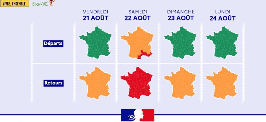 Samedi 22 août 2020, journée la plus chargée du week-end avec du rouge au niveau national dans le sens des retours. Des difficultés de circulation sont également attendues dans le sens des départs avec du orange au niveau national et ça sera même rouge autour de la Méditerranée.