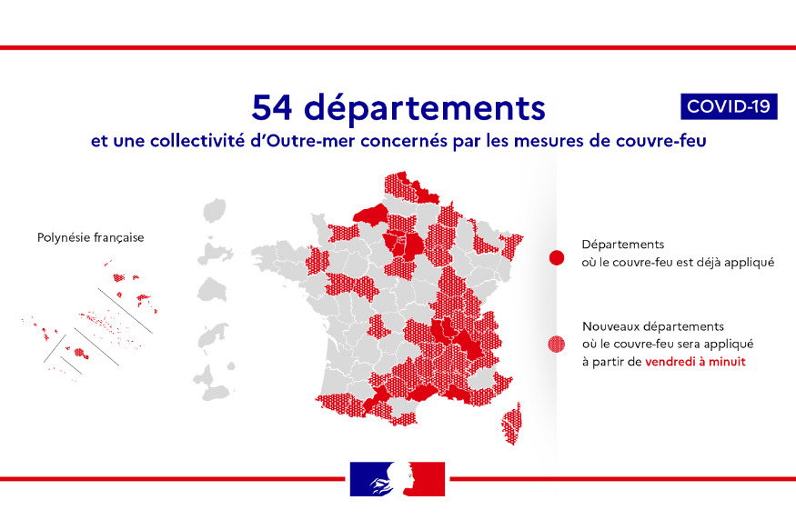 Le premier ministre Jean Castex a annoncé ce jeudi 22 octobre 2020, que 38 départements sont passés en alerte renforcée à la suite d'une forte dégradation des conditions sanitaires avec une forte hausse du nombre de personnes contaminées par le Covid-19 qui doivent aller à l'hôpital. Le couvre-feu va donc être mis en place sur ces départements à partir du vendredi 23 octobre 2020, à 23h59 et ceci durant au minimum 6 semaines. Il sera interdit d'être en extérieur pour un motif autre que professionnel ou sanitaire, entre 21h et 6h du matin. Sur ces 38 départements en plus, on trouve......
